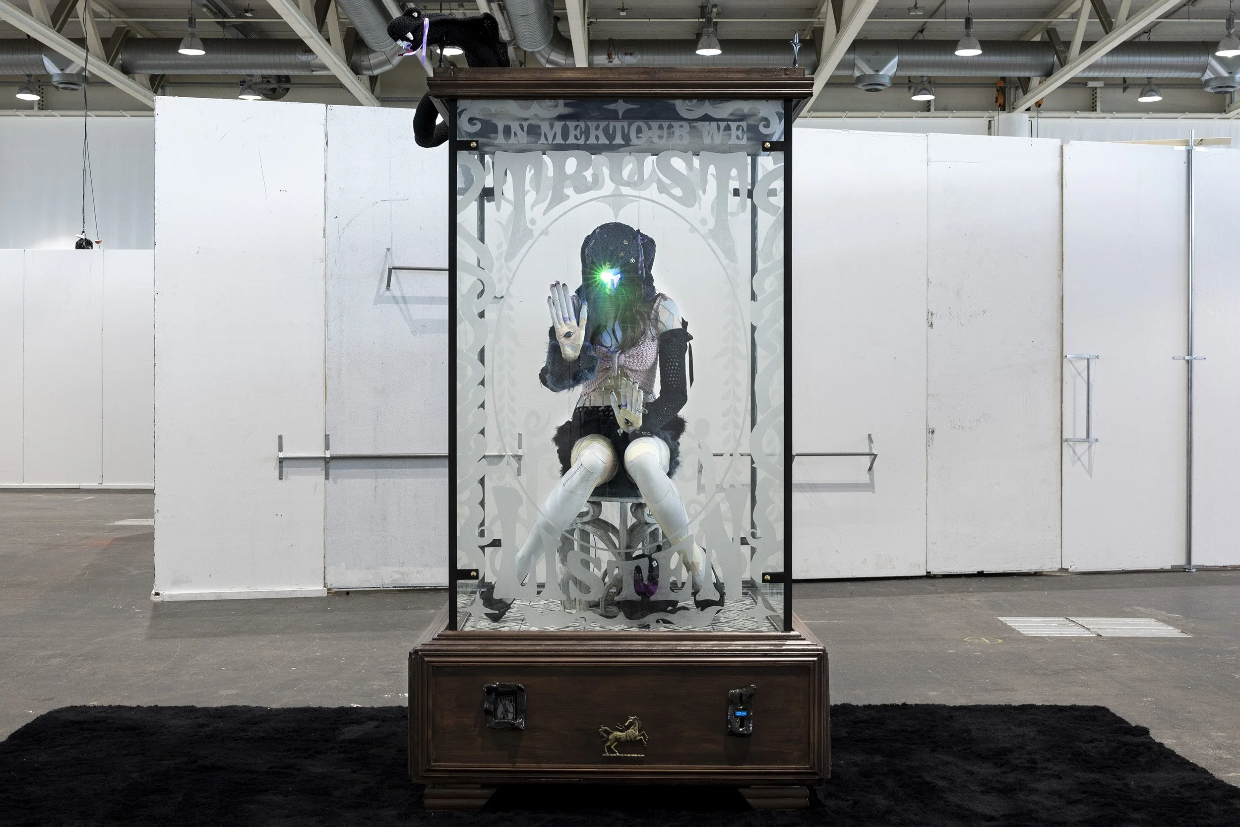 In connection with Crip Theory, “In Mektoub We Trust” invites reflection on the staging of non-conforming bodies and their instrumentalization within popular cultural practices. By embodying her own body inside this machine, the artist destabilizes the expectations surrounding bodily performance, while questioning aesthetic norms and the historical exclusion of non-normative artists.